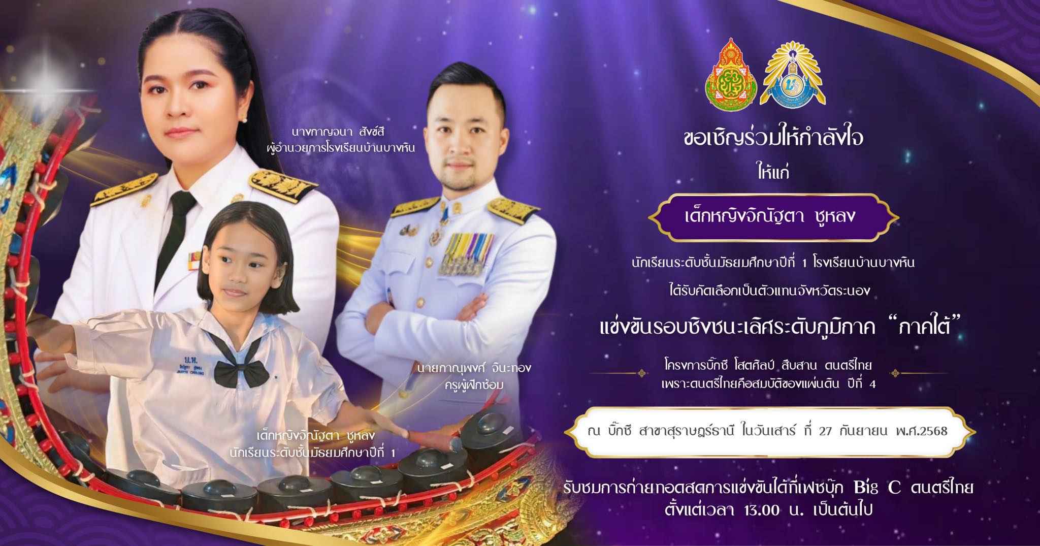 ขอเชิญร่วมส่งแรงใจให้ลูกหลานชาวบางหิน เด็กหญิงจิณัฐตา ชูหลง นักเรียนระดับชั้นมัธยมศึกษาปีที่ 1 เป็นตัวแทนจังหวัดระนองในการแข่งขันรอบชิงชนะเลิศระดับภูมิภาค “ภาคใต้”