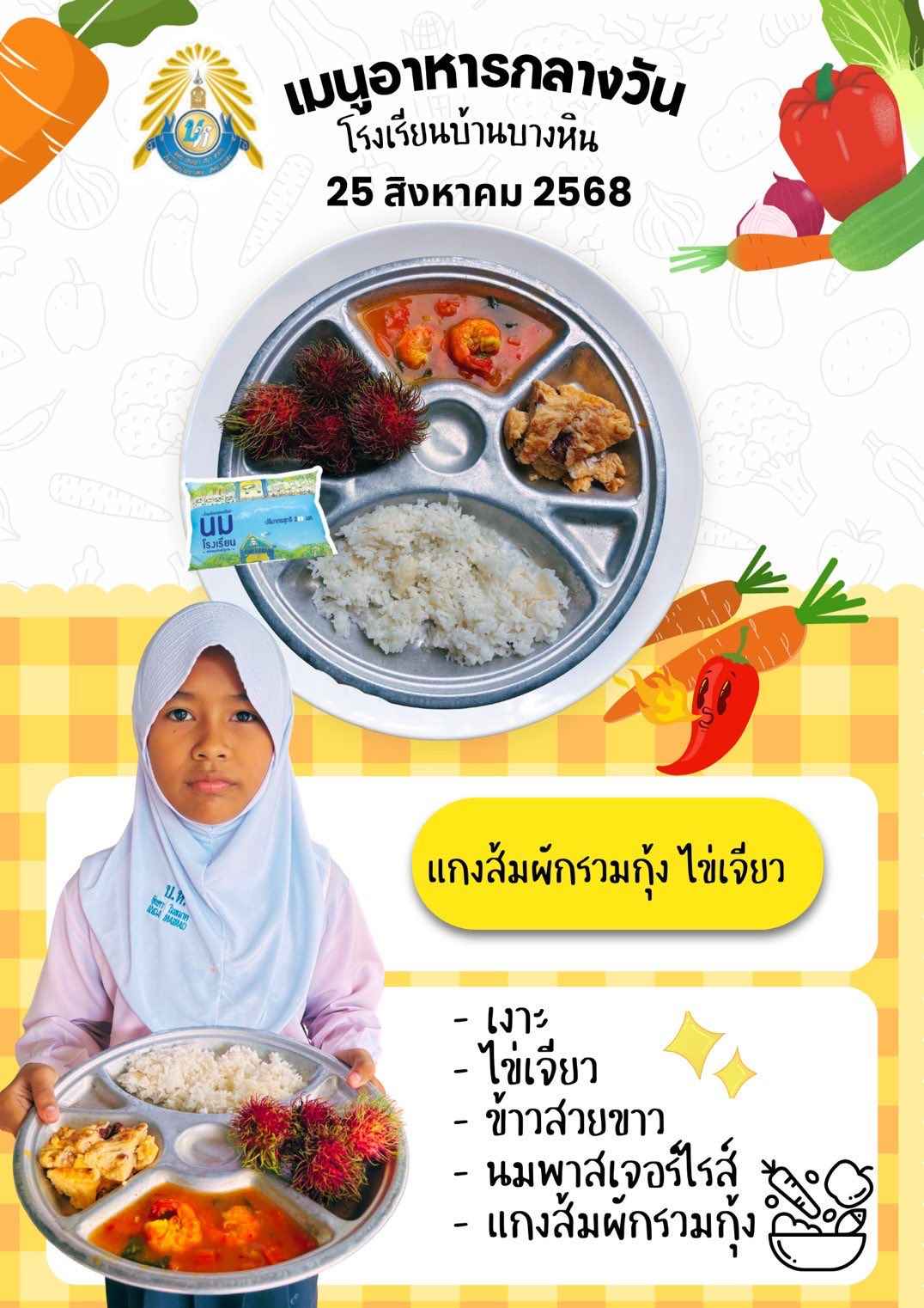 รายการอาหารกลางวันนักเรียนโรงเรียนบ้านบางหิน ประจำวันที่ 25 - 29 สิงหาคม พ.ศ. 2568